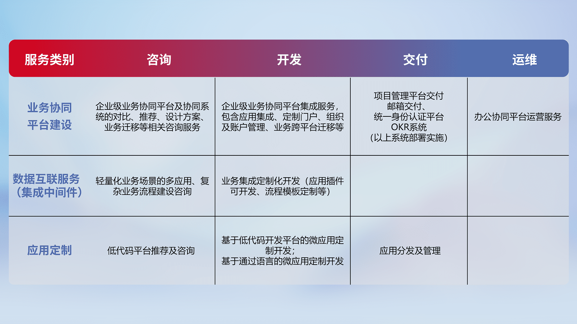针对钉钉、、企微、、、、IDaas等平台级产品提供产品的规划、、、、方案、、、、交付、、、定制化开发等服务,,,,实现如统一协同办公、、、、智能客户服务、、、、混合会议管理、、、智能数据查询、、、等业务场景,,,,实现数字化转型。。