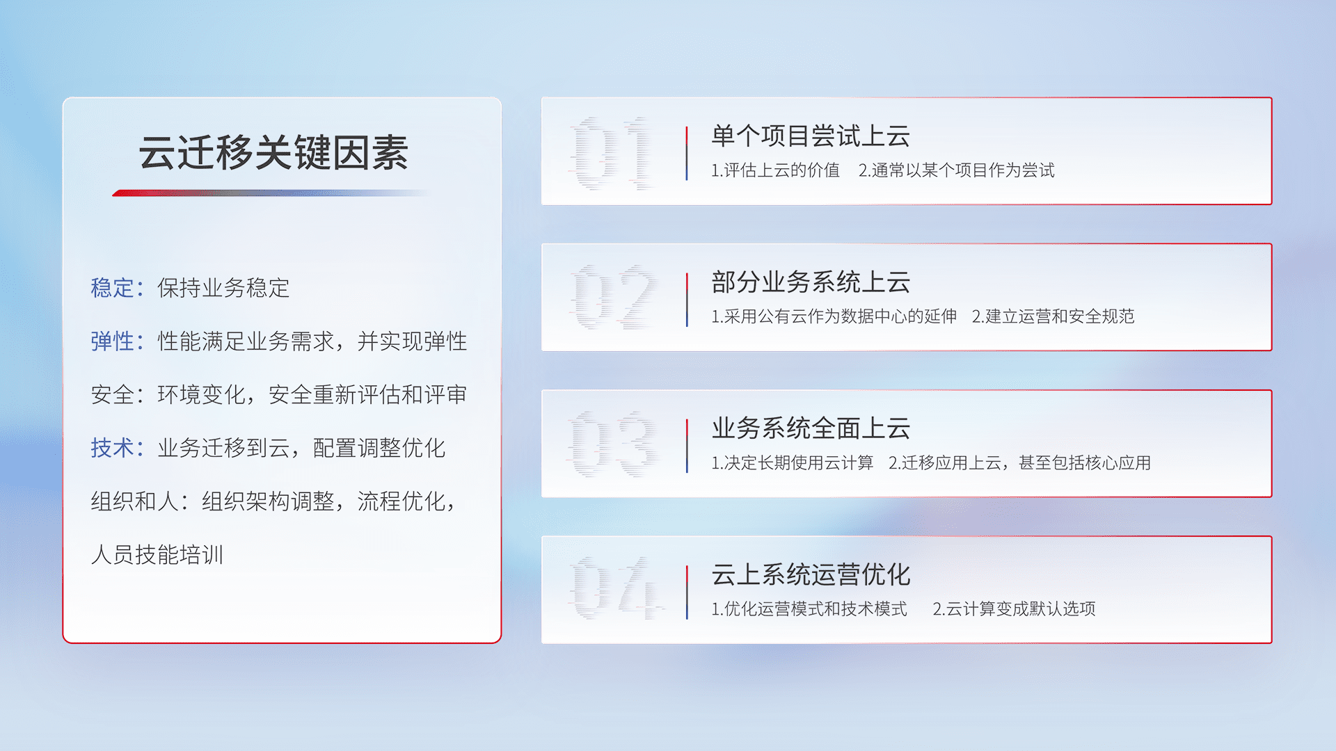结合实际业务,,从规划设计、、云平台选型、、、、云原生改造、、数据迁移、、、集成交付,,,,迁移全过程为客户识别最佳上云路径,,,做好风险识别管理,,,设计网络架构、、、身份权限、、安全审计合规、、操作审计、、、、日志审计、、、、监控告警策略、、多站点容灾设计等,,,,对云上基础设施进行整体规划,,提升IT治理水平,,以满足弹性、、高可用、、、高性能的需求。。。。