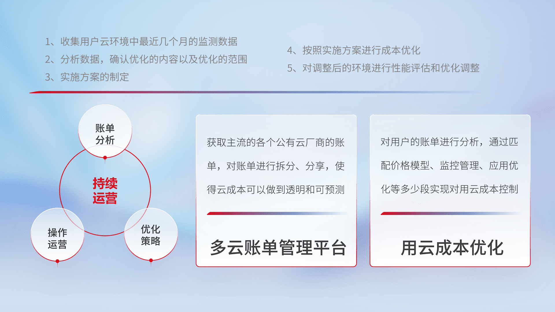 通过多云纳管,,以统一的资源数据模型把客户的云资源进行抽象和封装,,进而实现对多云资源的统一操作,,,保障云资源管理的可靠性、、稳定性与可用性。。。。量身定制化运维内容,,,,配置、、开发运维、、补丁管理、、、备份、、、监控、、认证和访问管理、、、审计和日常巡检等,,,保障在用云过程中的可靠度,,,,稳定度以及高可用率。。