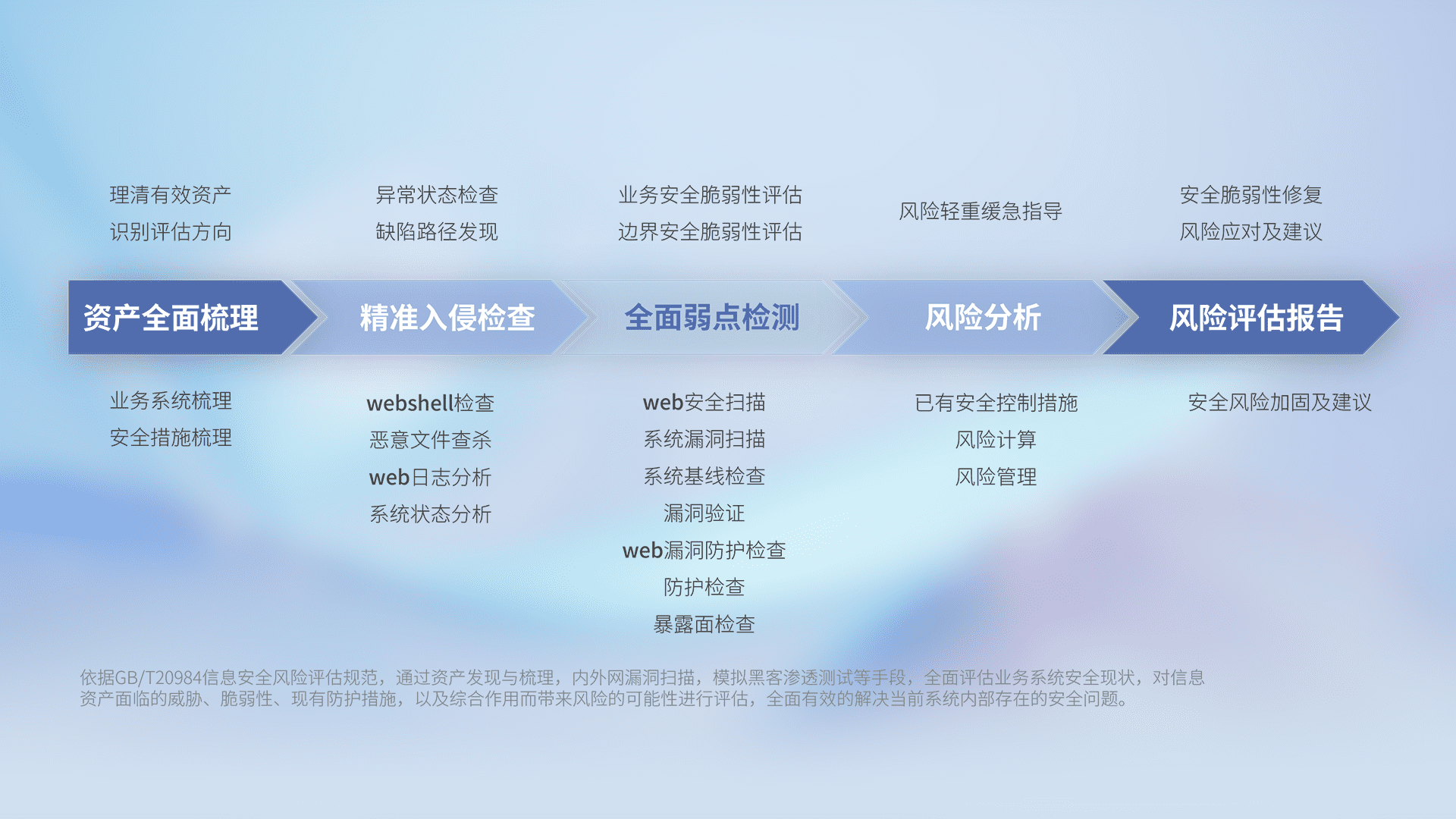 针对客户行业特性,,,以专业的安全服务+多厂商联合解决方案提供专属的一站式安全管理服务,,帮助客户全面感知网络空间威胁,,基于识别、、、、检测、、、、分析、、、、防护、、、监测、、、、响应的服务理论模型,,,,从方案咨询、、、集成交付、、、评估验证、、、优化加固、、运维运营,,,致力于为客户提供完整的闭环管理式安全服务。。。以实战经验为客户打造高抵御风险的安全体系,,,,帮助客户发现威胁、、、、对抗威胁、、处置威胁,,不断积累安全对抗能力,,持续保障数字化安全。。。